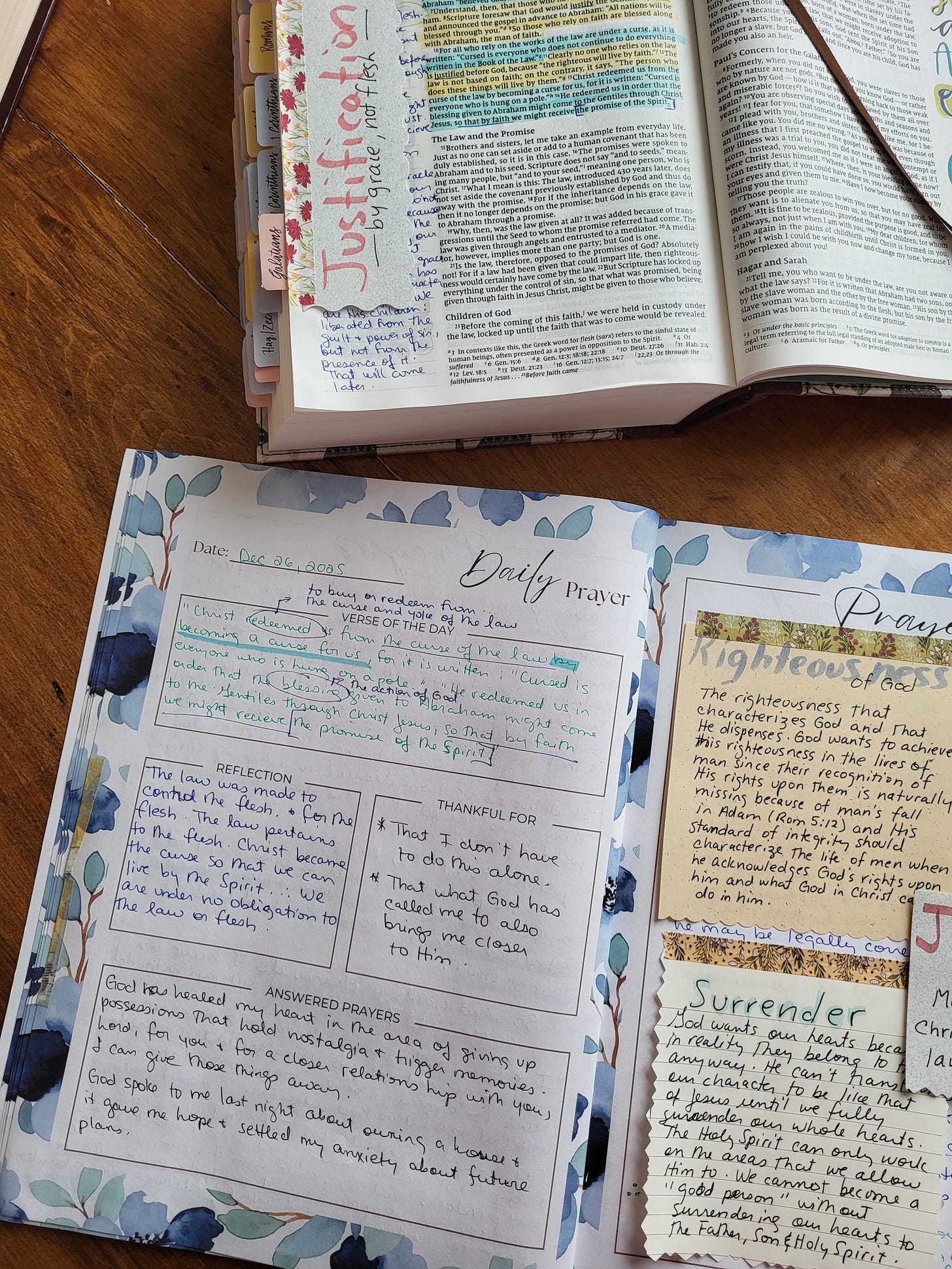 If I have extra thoughts or prayers that didn’t fit, I’ll add pieces of lined paper or pretty decorative paper to the page. I use stickers* or tip-ins to make it look beautiful. This isn’t about being an artist; it’s about worshipping the Creator with creativity. It makes the journal feel personal, like a keepsake of my journey with Him.