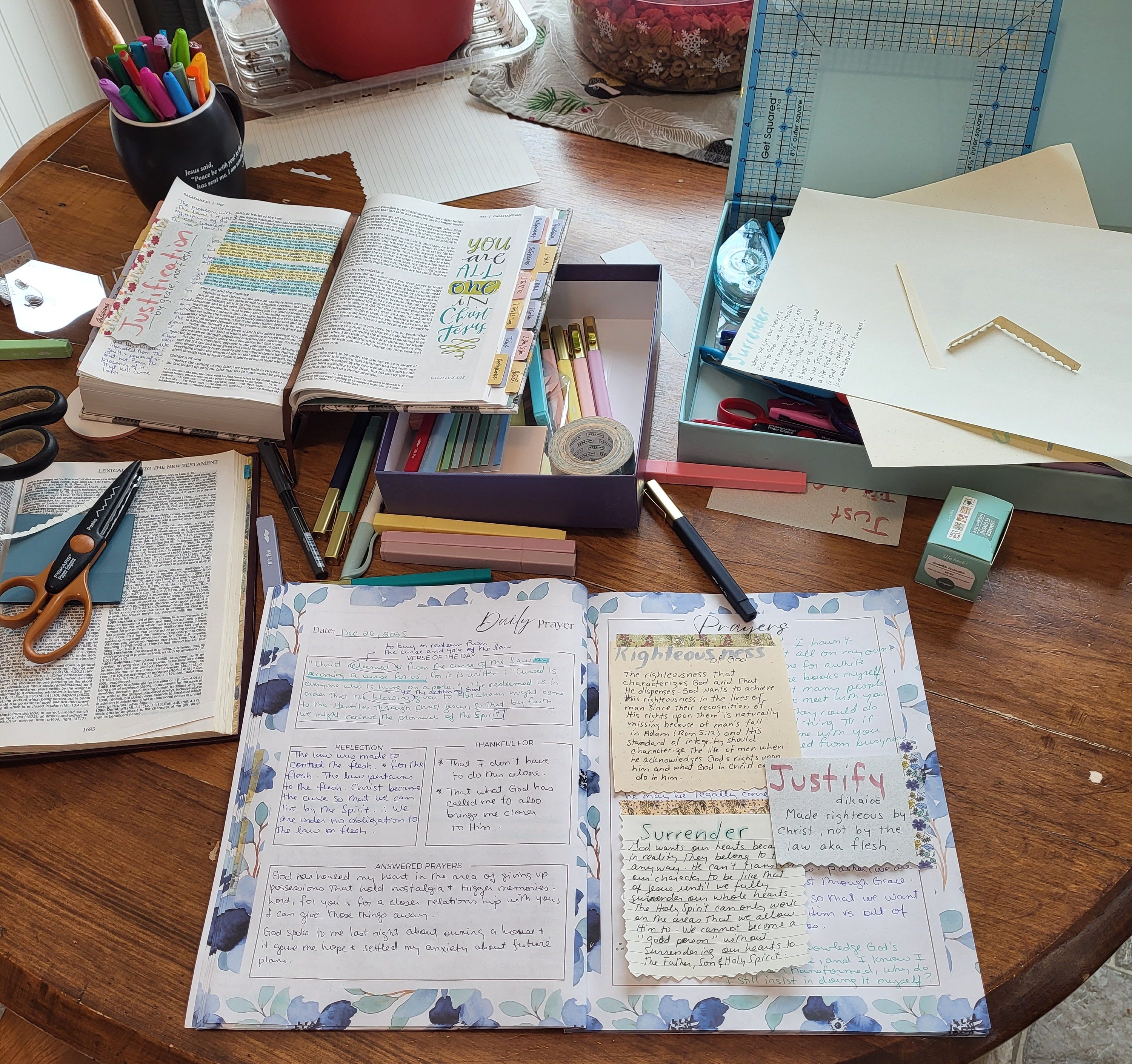 I clear off the kitchen table and set out all the tools I’ll need: washi tape, coloured paper, glue tape, and my favourite pens and highlighters.* I also bring out my Greek/Hebrew Key Study Bible, though there are wonderful online tools if you don’t have one. There is something holy about preparation; it tells your spirit that something important is about to happen.